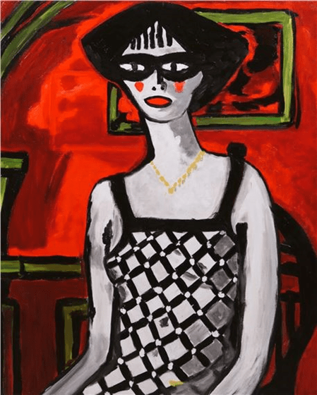 En Yvette ou la robe à carreaux todo eso se concentra. Chabaud insiste en sus ojos marcados de negro, en la expresión frontal que no esquiva al espectador. Ella se protege tras un antifaz de pintura oscura y mira de frente, sin concesiones. Hay en su figura algo de mujer fatal, pero también una atracción magnética. El color, lejos de ser celebración, se vuelve tensión: vida nocturna, verdad sin pulir. La belleza macabra y casi enfermiza de quien ha aprendido a sobrevivir en la penumbra resulta intensamente atractiva, hasta hacer imposible apartar la mirada de su vestido a cuadros.